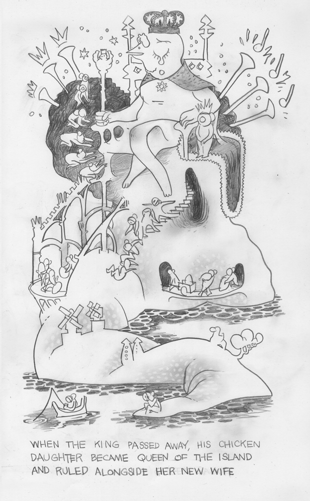 An insular island community pulls an egg from a tidepool, from which hatches the apocalypse in the form of a vast, cruel chicken. Wicked Chicken Queen follows the violent societal collapse of the island under the reign of the chicken queen.